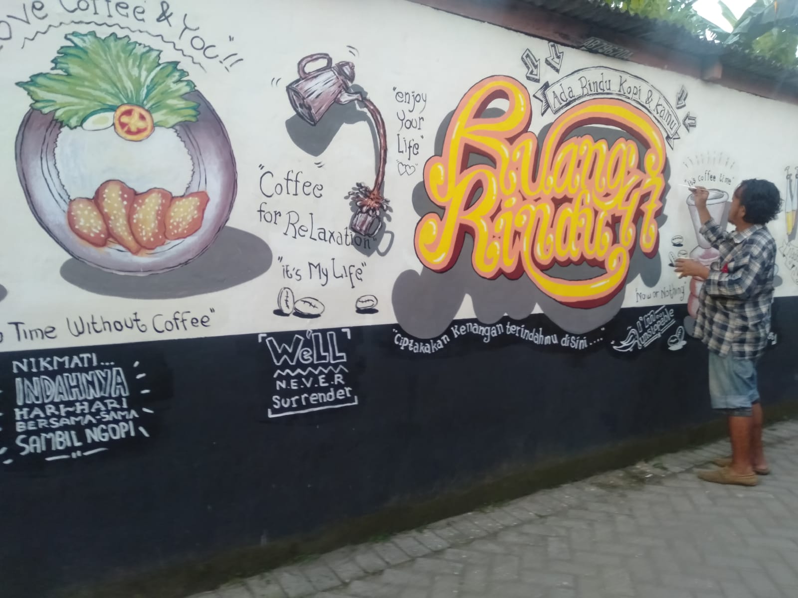 “Itu mural yang besar, saya lukis Gunung Merapi, Tugu Jogja, sampai ke suasana kampung. Tapi sayangnya saya minim dokumentasi pribadi,” ceritanya sambil tersenyum.