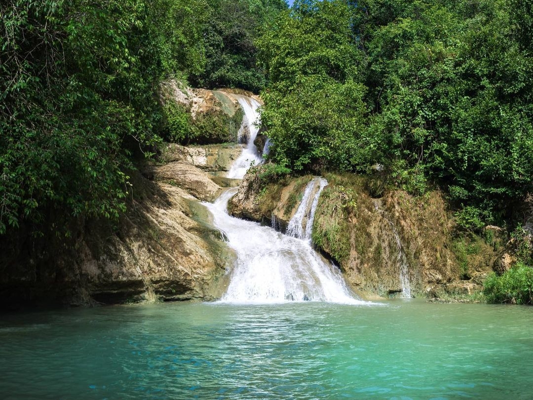 Air Terjun ini menghadap ke arah pantai dan airnya mengalir langsung ke laut dan di bawahnya terdapat goa kecil yang dapat kamu telusuri dengan menerobos air terjun. Kamu bisa bermain air dan berenang di sekitar air terjun karena aliran airnya tidak terlalu deras.